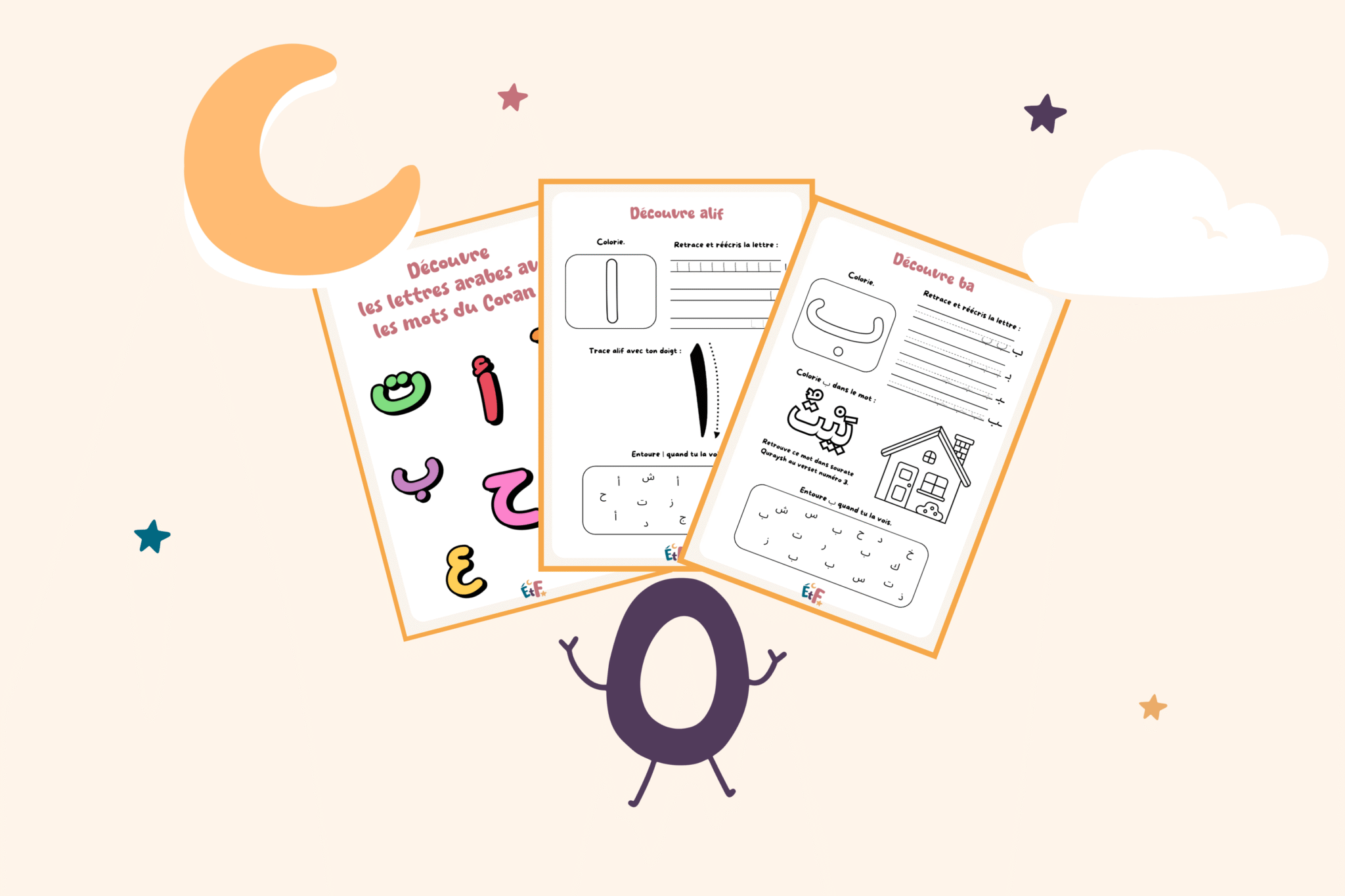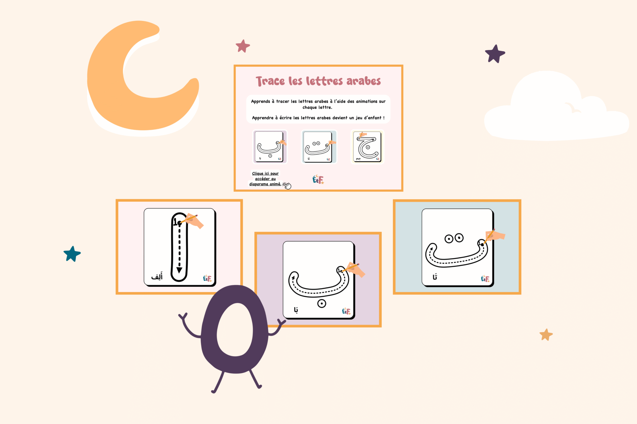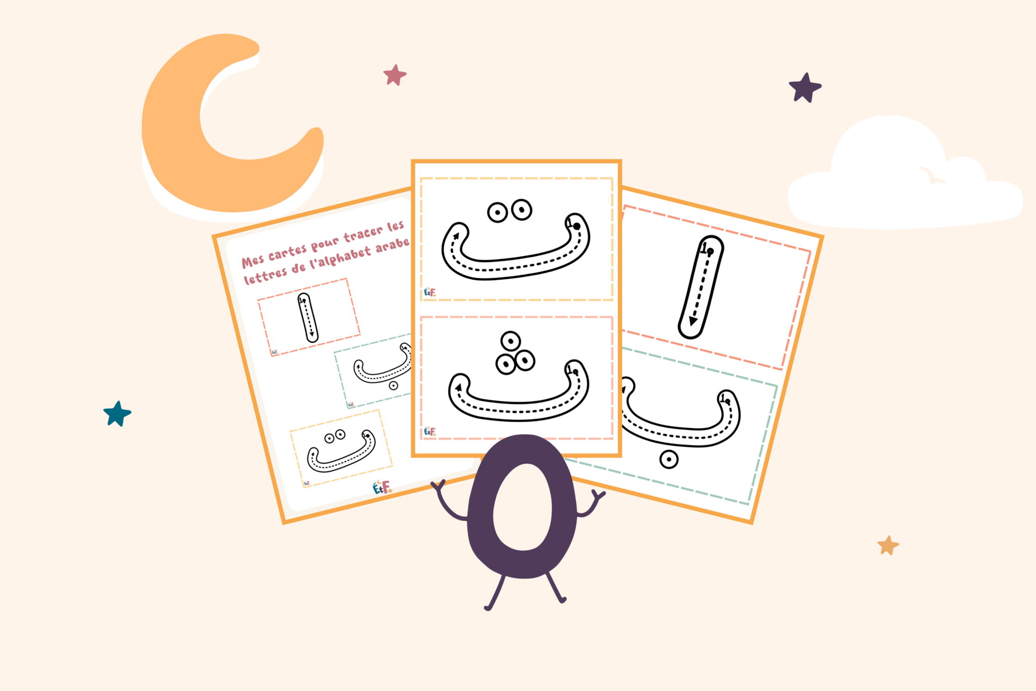 Des cartes permettant aux enfants de s’exercer à tracer les lettres arabes.