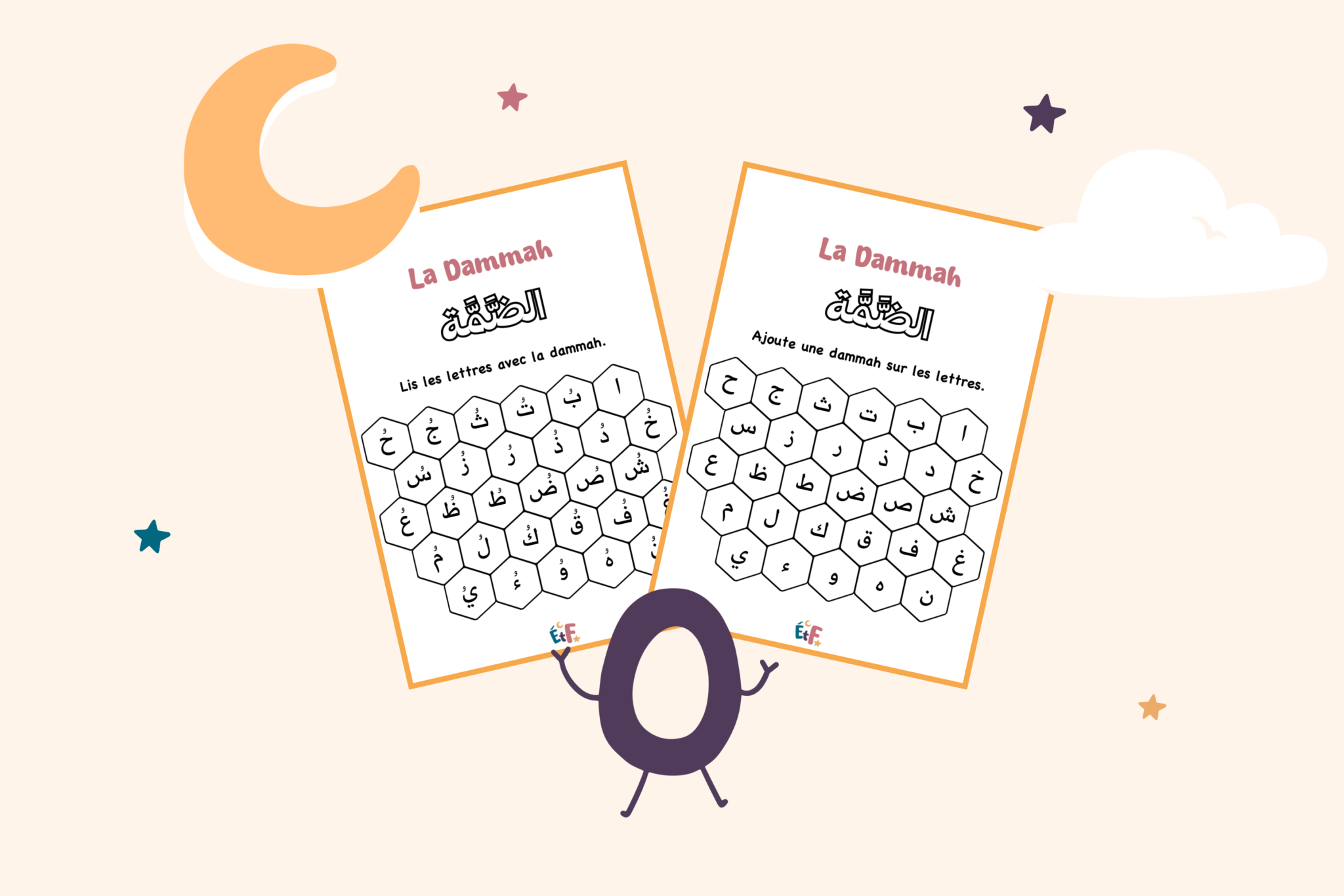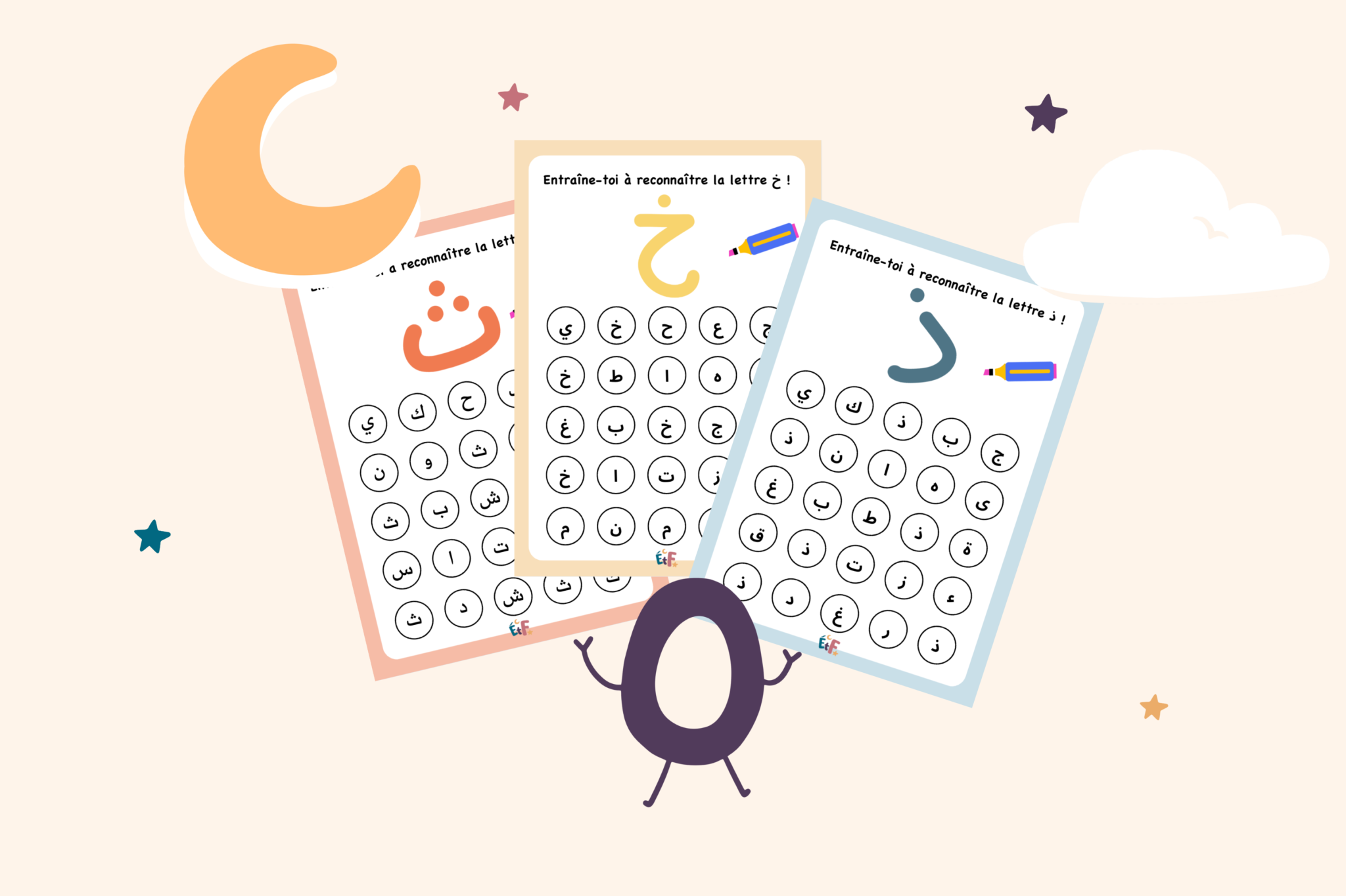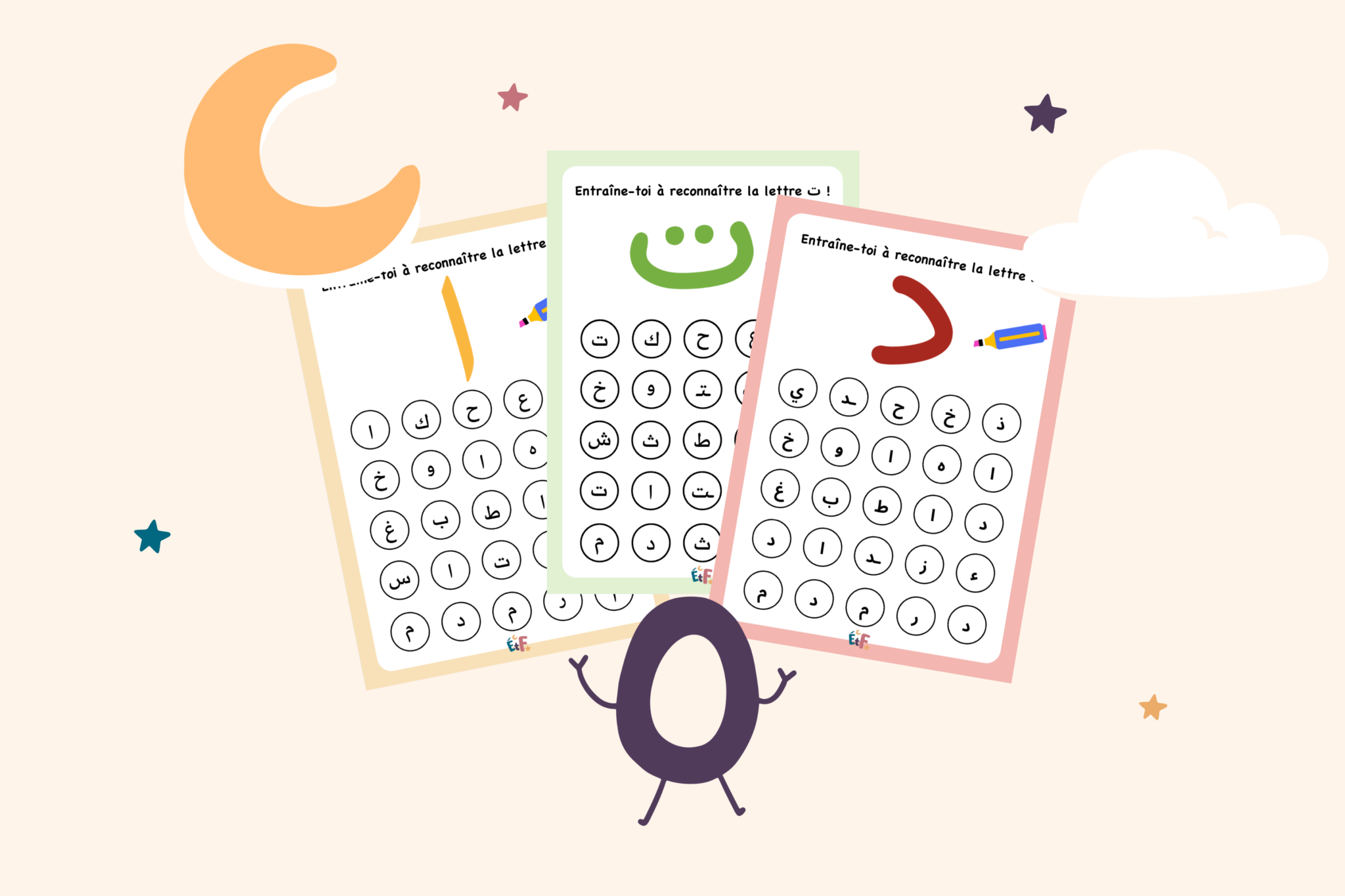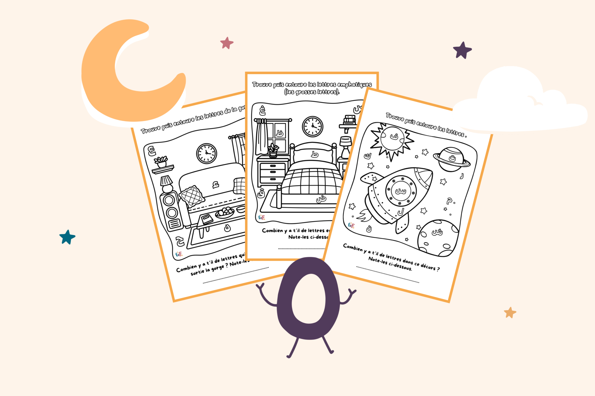 Identifie les lettres de l’alphabet arabe dans les coloriages.
