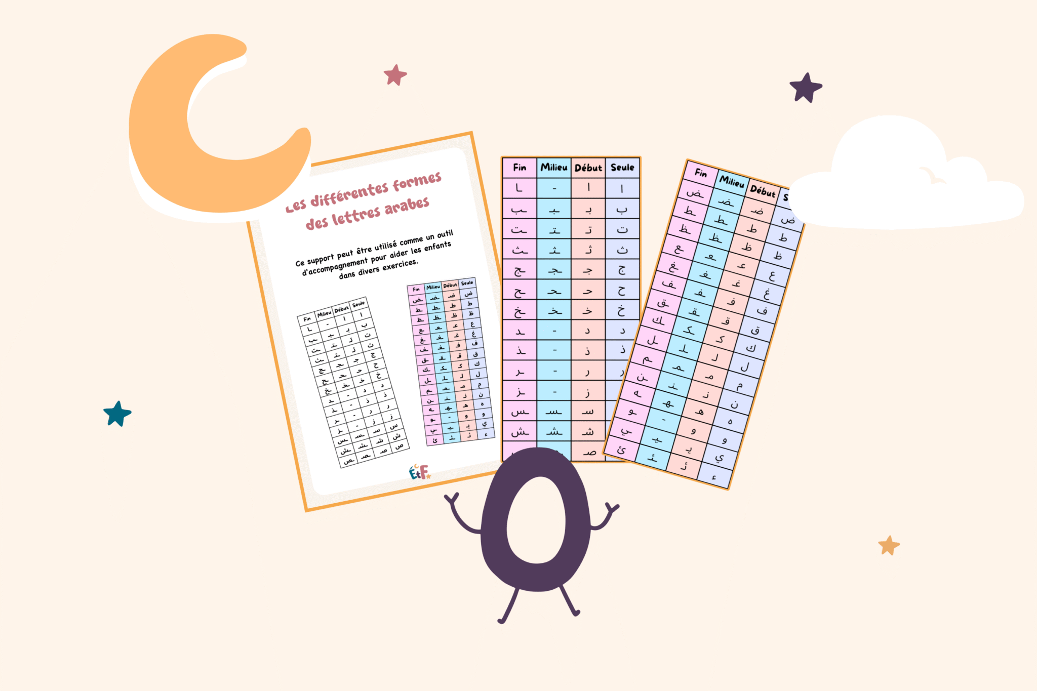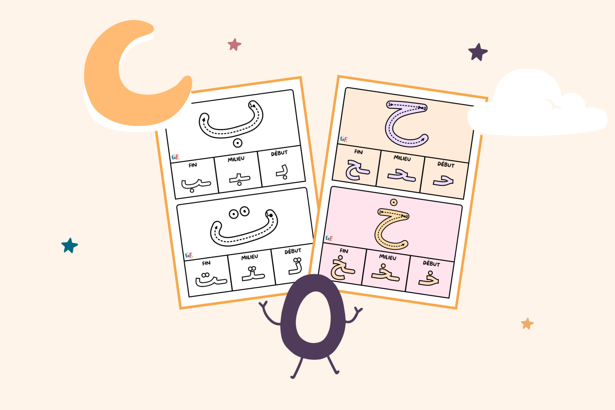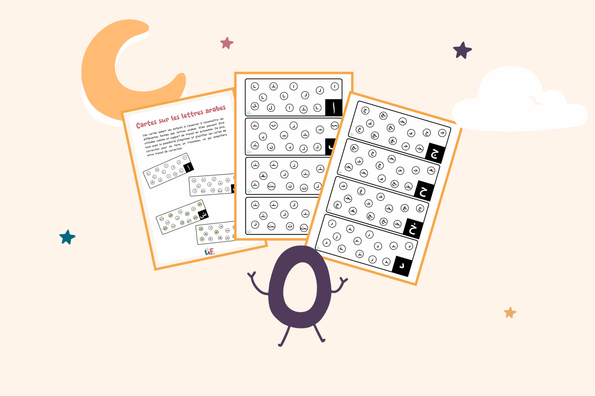 Ces cartes aident les enfants à s’exercer à reconnaître les différentes formes des lettres arabes.