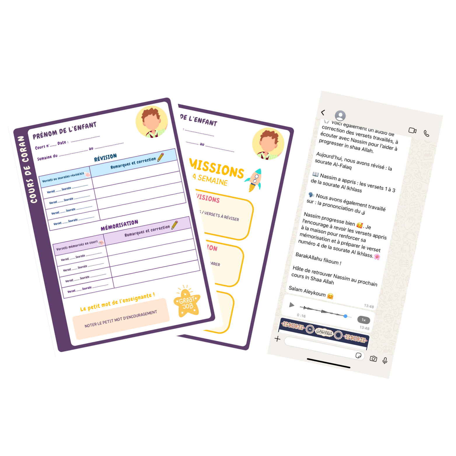 Et pour couronner l’année en beauté : Chaque enfant reçoit en fin d’année son propre dossier scolaire de Coran, un joli récap de ses efforts, de ses progrès et de ses petites victoires