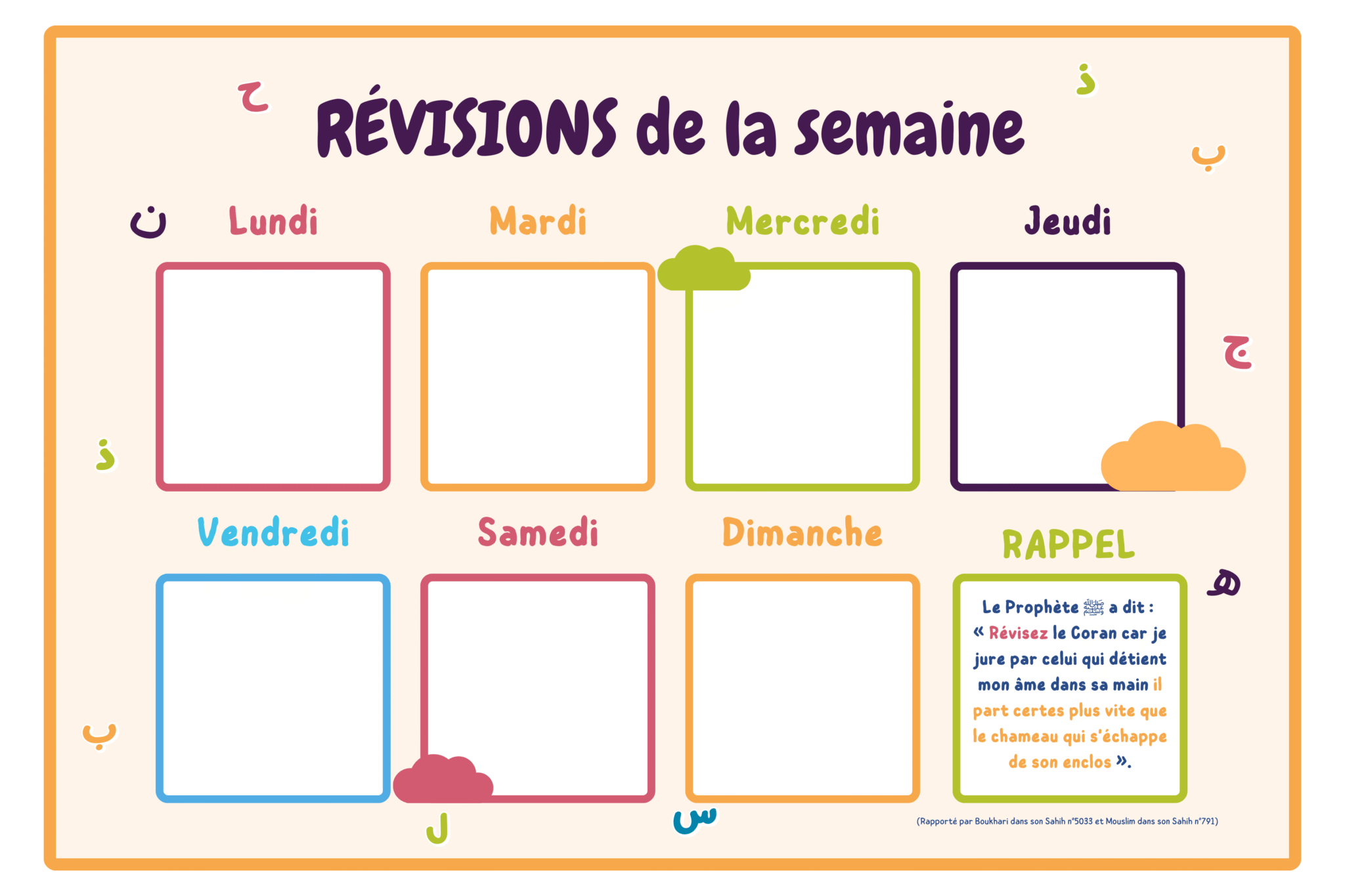 La révision est une étape clé du processus d’apprentissage ! Les enfants pourront inscrire les sourates ou versets à réviser dans leur semainier.